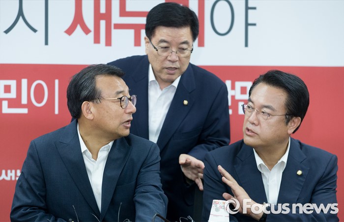 (서울=포커스뉴스) 11일 오후 서울 여의도 국회에서 열린 전기세 누진제 개편 긴급 당정 협의에 참석한 이정현(왼쪽부터) 새누리당 대표, 김광림 정책위의장, 정진석 원내대표가 대화하고 있다.