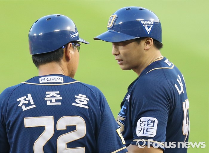(서울=포커스뉴스) 11일 서울 잠실구장에서 열린 2016 프로야구 NC-LG 경기 3회초 무사 1,2루에서 NC 나성범이 1타점 우전 안타를 치고 1루에서 전준호 코치와 대화하고 있다.