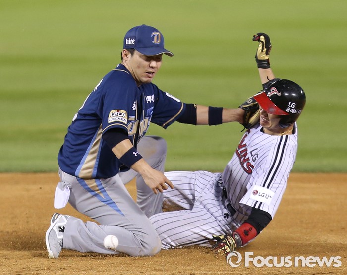 (서울=포커스뉴스) 11일 서울 잠실구장에서 열린 2016 프로야구 NC-LG 경기 4회말 1사 1,3루에서 LG 1루주자 손주인이 2루 도루를 시도해 슬라이딩하며 NC 유격수 지석훈의 글러브에 얼굴을 부딪히고 있다.