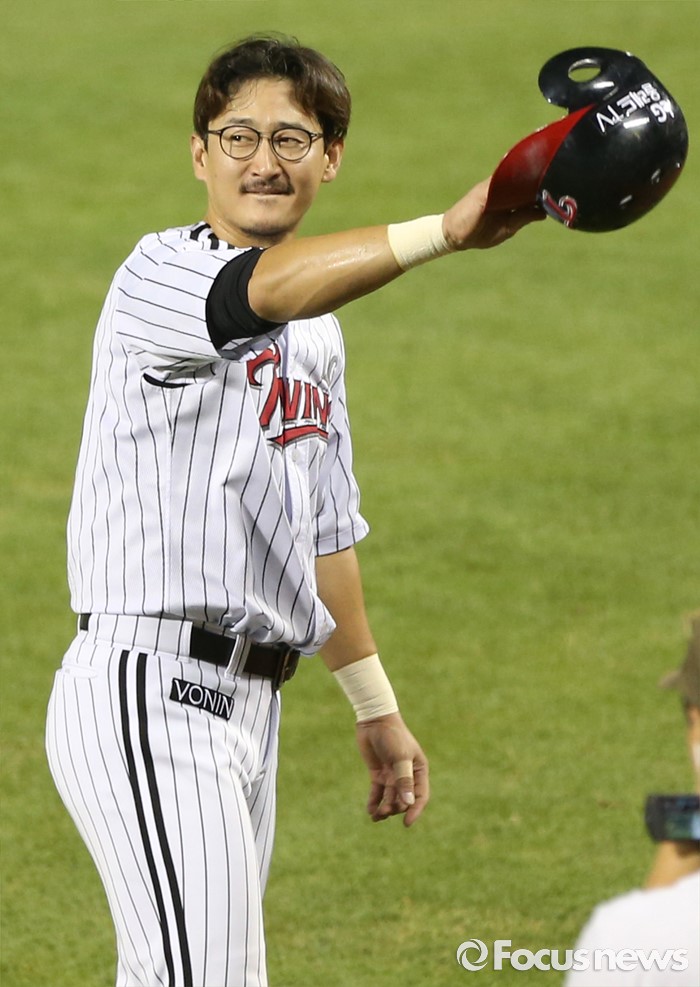 (서울=포커스뉴스) 11일 서울 잠실구장에서 열린 2016 프로야구 NC-LG 경기에서 KBO리그 통산 6번쨰 2천 안타를 기록한 LG 박용택이 꽃다발 전달식을 가진후 관중석을 돌아보며 헬멧을 벗어 인사하고 있다.