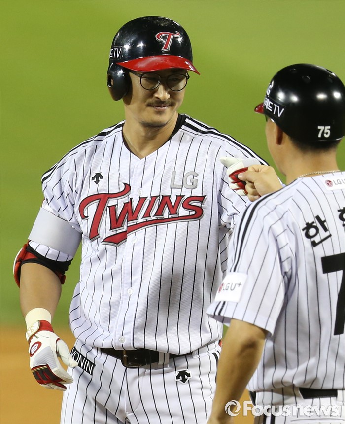 (서울=포커스뉴스) 11일 서울 잠실구장에서 열린 2016 프로야구 NC-LG 경기 7회말 2사후 LG 박용택이 우전 안타를 쳐 KBO리그 통산 6번쨰 2천 안타를 기록하고 1루에서 한혁수 코치의 축하르 받고 있다.