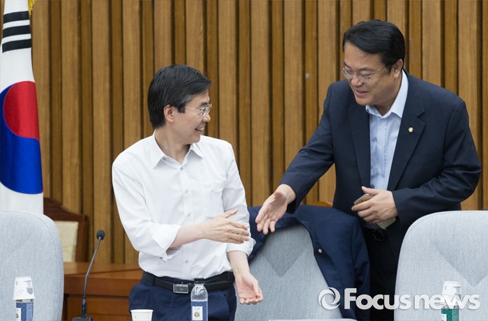 (서울=포커스뉴스) 정진석(오른쪽) 새누리당 원내대표와 조경태 기획재정위원장이 12일 오전 서울 여의도 국회에서 열린 원내대책회의에 참석해 인사하고 있다.