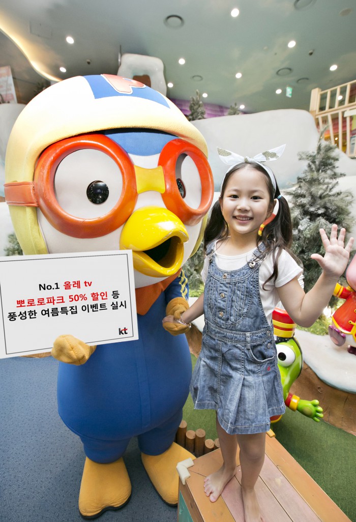 어린 자녀가 있는 부모들을 위해서는 9월18일까지 올레tv와 올레tv 모바일에서 진행하는 ‘100원관’VOD 구매고객 대상으로 뽀로로 파크 입장권 50% 할인 혜택을 준다. 해당 할인 혜택은 잠실 롯데월드점, 코엑스점, 일산 킨텍스점 등 전국 7개 지점에서 이용 가능하며, 이벤트 응모 후 모바일로 수신한 쿠폰을 현장 매표소에 제시하면 된다. 뽀로로파크는 뽀로로와 친구들을 직접 만나볼 수 있는 국내 유일의 대규모 테마파크다.